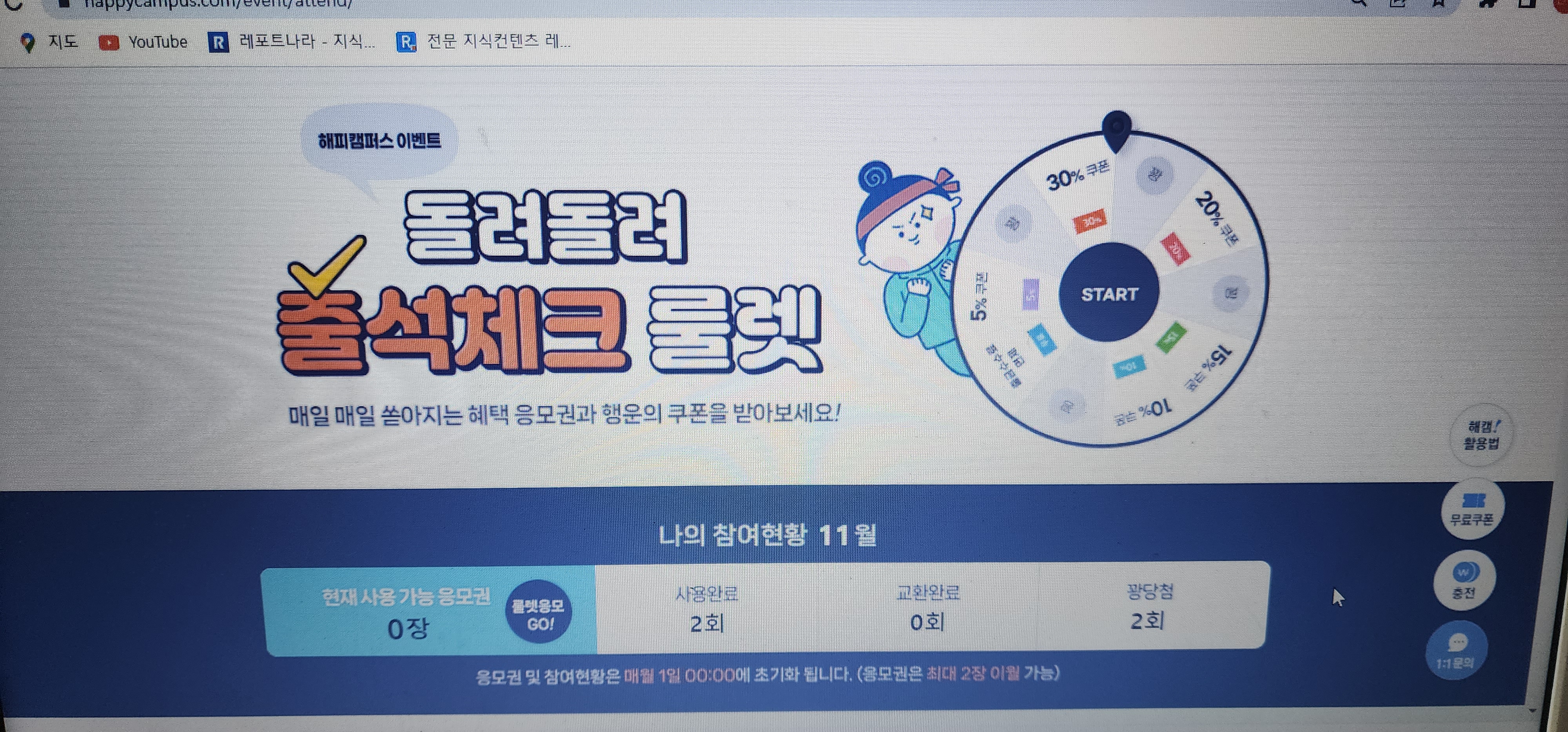 해피캠퍼스는 매일매일 출석체크 이벤트를 통해 할인쿠폰 등을 지급하고 있다.